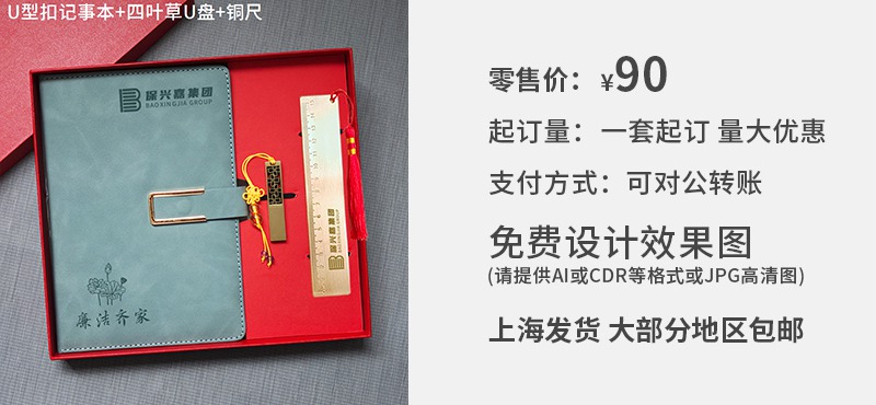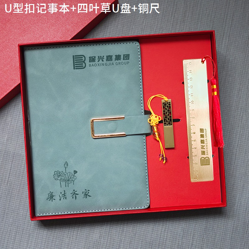 U型扣记事本+四叶草U盘+铜尺 礼盒套装