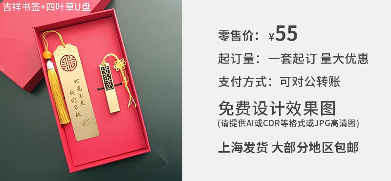 黄铜吉祥书签+四叶草U盘 礼盒套装